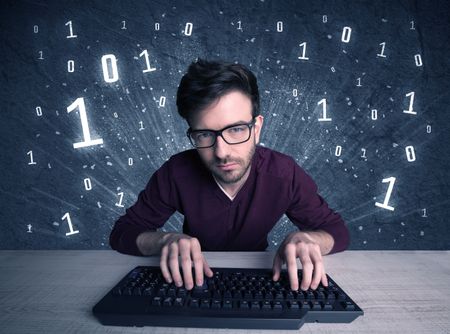 A funny hacker working hard on online passcode scanning and solving passwords with 0 1 numbers illustration in background concept