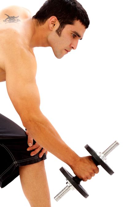 man full of power and strength doing weights isolated over a white background