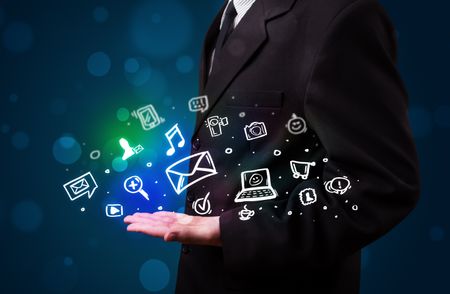 Man pressing notebook laptop computer with doodle icon media cloud symbols
