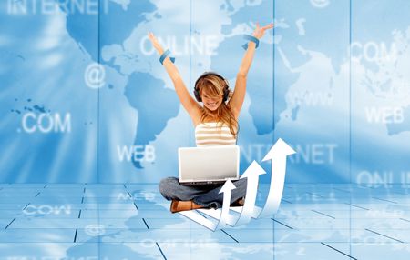 A man standing on a ladder and drawing a chart on blue wall background with exponential progressing curve, line