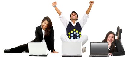 Man touching an imaginary screen - isolated over a white background
