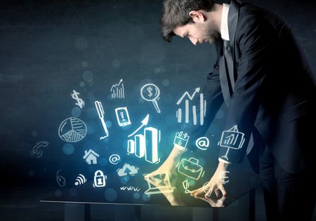 Pie chart graph icons and symbols on laptop screen with office accessories