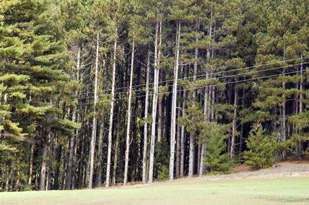 Power lines by pines at edge of field