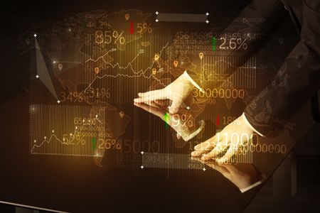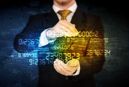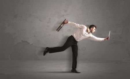 Running businessman in a rush with device in hand on background