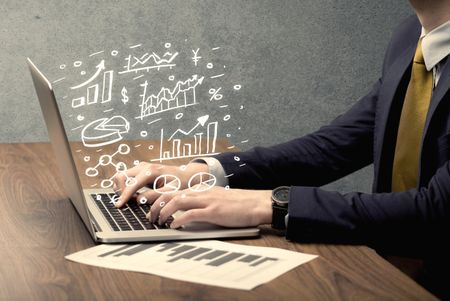 Sales person in suit using a laptop to calculate pie chart and exponential growth statistics on office desk concept