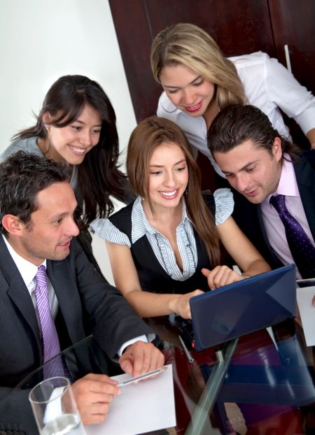 Unposed group of creative business people in an open concept office brainstorming their next project.
