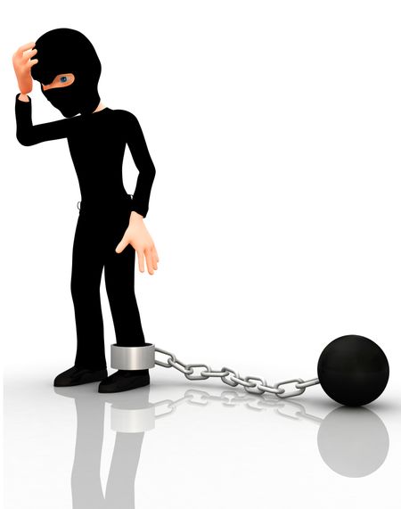 3D arrested thief with a ball and leg chain ? isolated over a white background