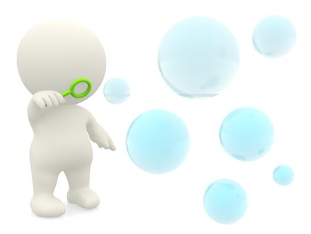 3D character blowing soap bubbles - isolated over a white background