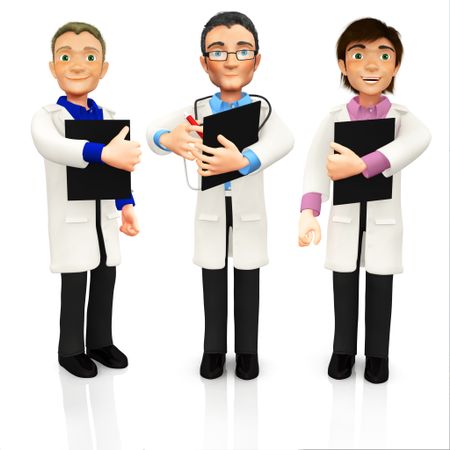 3D group of doctors with a stethoscope and clipboards - isolated over a white background