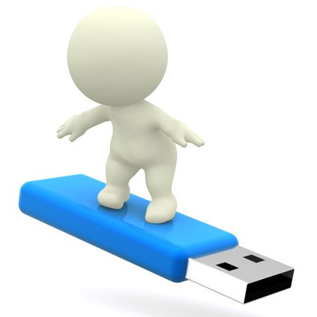 3D guy surfing on a USB - isolated over white