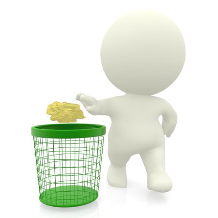 3D guy throwing paper in the bin - isolated over a white background