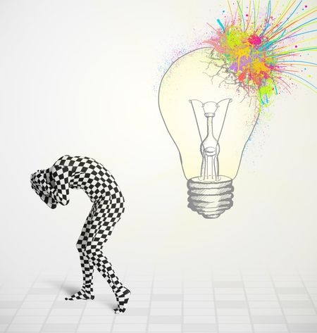 3d human character is body suit morphsuit looking at abstract colorful lightbulb