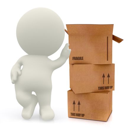 3D man with cardboard boxes in high detail isolated over a white background
