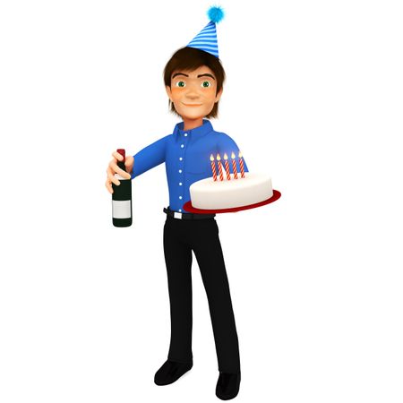 3D Man celebrating a birthday with a cake and a bottle of wine - isolated
