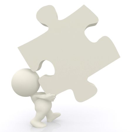 3D man lifting big puzzle piece isolated over white