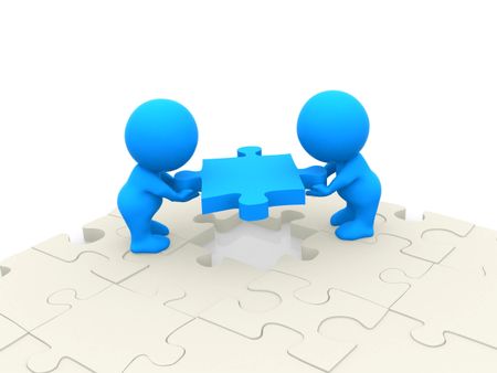 3D people making a puzzle isolated over a white background