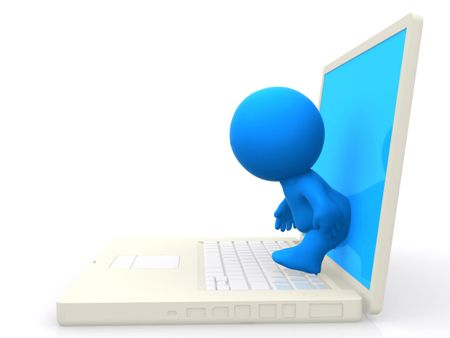 3d person stepping out of a laptop screen - isolated over white