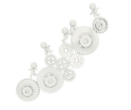 3D team assmbling cogwheels and aiming for the top - isolated over white