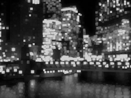 Abstract of city lights in black and white, with reflections of river below skyscrapers at night