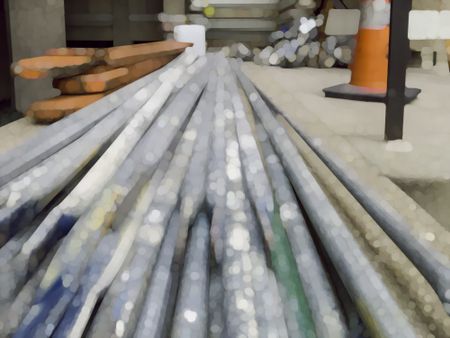 Abstract of detail on construction site: Impressionistic illustration of long steel bars and other equipment for assembly of scaffolding