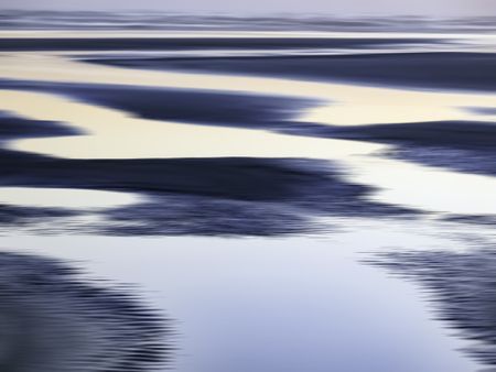 Abstract of luminous tide pools on sandy beach near sunset along the Pacific coast of Olympic Peninsula in Washington, USA, for themes of nature, serenity, the environment (one of a series)