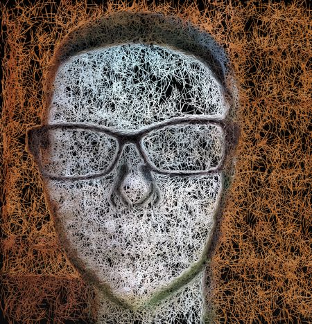 Abstract of plastic head of nerd with horn-rimmed eyeglasses