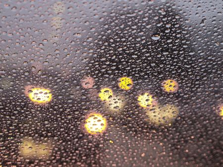 Abstract of rain at rush hour: Raindrops all over windshield (selective focus)