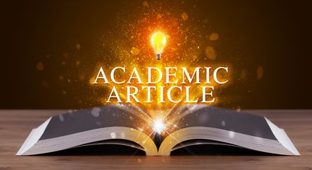 ACADEMIC ARTICLE inscription coming out from an open book, educational concept