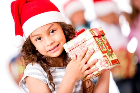 Adorable girl holding Christmas present and wearing Santa's hat