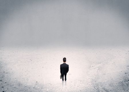 An adult elegant businessman standing in the middle of nowhere in empty grey concrete space background concept