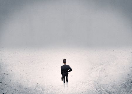 An adult elegant businessman standing in the middle of nowhere in empty grey concrete space background concept
