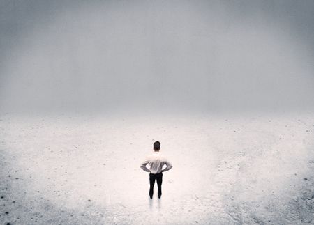 An adult elegant businessman standing in the middle of nowhere in empty grey concrete space background concept