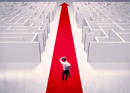 An adult elegant businessman standing on a red carpet arrow pointing ahead through a street with maze on two sides concept