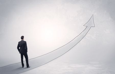 Adult elegant male with briefcase standing on drawn grey arrow pointing up financial concept