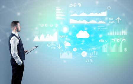 Adviser standing and presenting economical results and report of a multinational company
