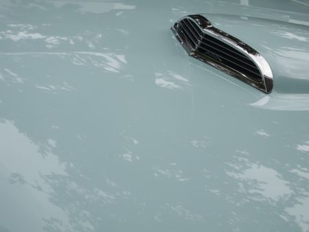 Air intake on reflective light green hood of classic car