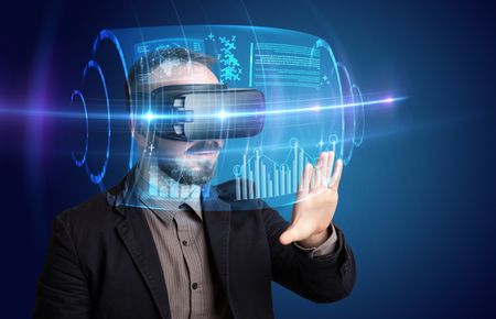 Amazed businessman with high tech 3D projection in front of him