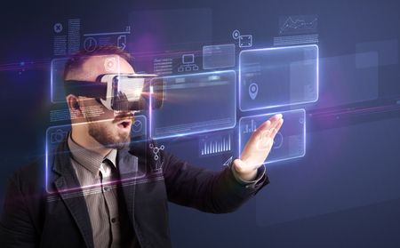 Amazed businessman with virtual reality charts and data in front of him