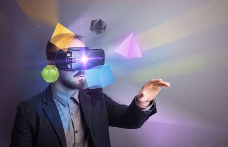 Amazed businessman with virtual reality colorful geometric shapes in front of him