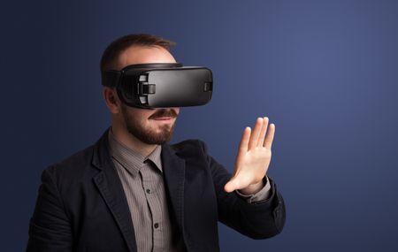 Amazed businessman with virtual reality goggles