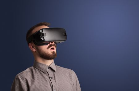 Amazed businessman with virtual reality goggles