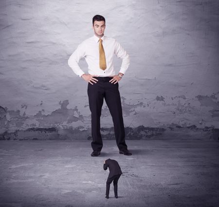 Angry big manager looking at small business man concept on background