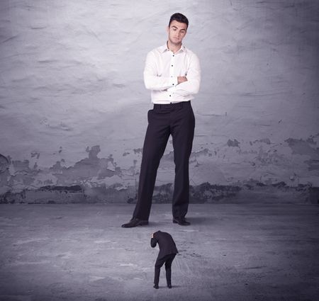 Angry big manager looking at small business man concept on background