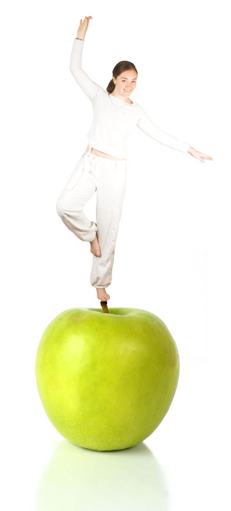 apple in green with reflection and a lady on top balancing