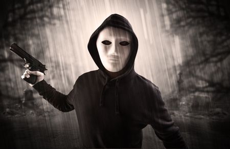 Armed aggressive hunter in abandoned thick forest graveyard concept