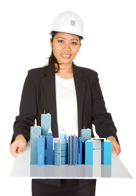 asian female architect showing her project - isolated over a white background