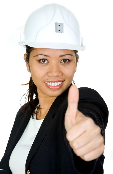 asian female architect with her thumbs up - isolated over white background with the focus on her eyes