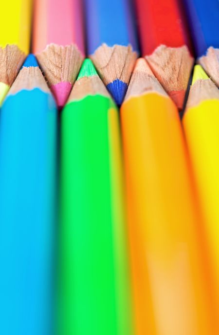 assorted colour pencils close up in perspective with focus on the tips using a shallow depth of field