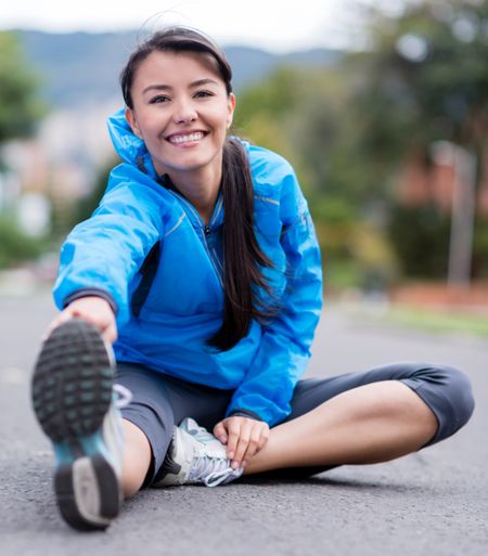 Athletic woman stretching outdoors and looking happy