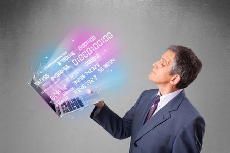 Attractive businessman holding notebook with exploding data and numbers